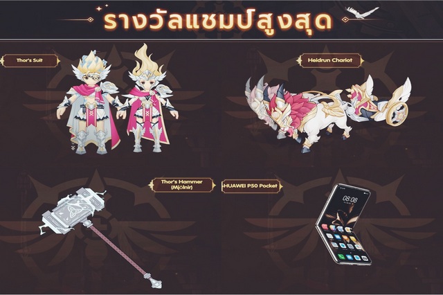 และยังได้รับคอสตูม Thor’s Hammer (Mjölnir), คอสตูมปีกพิเศษสำหรับผู้ชนะ และถ้วยรางวัลแชมป์สุดพิเศษ ที่จะปรากฏบนรางวัลคอสตูม รวมถึงนักผจญภัยทีอยู่ในเซิร์ฟเวอร์เดียวกับกับทีมที่ชนะ จะได้รับ 2,000 Odin’s Blessings ที่จะมอบให้ผู้เล่นทุกคนทุกวันต่อเนื่องเป็นระยะเวลา 1 สัปดาห์