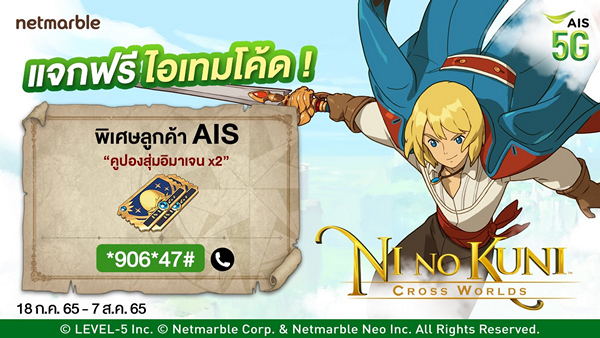 Ni no Kuni: Cross Worlds เกมอนิเมะสุดน่ารักแนวสวมบทบาท (MMORPG) จับมือร่วมกับ AIS มอบของขวัญสุดพิเศษให้กับลูกค้า AIS แจกแล้วแจกอีก แบบ Non-Stop เพียงกดรหัส *906*47# แล้วกดโทรออก เพียงเท่านี้ก็สามารถรับไอเทมสุดปังอย่าง “คูปองสุ่มอิมาเจน x 2” ฟรีทันที! อย่ารอช้ารีบเลย เพียง 7,500 สิทธิ์แรกเท่านั้น!! ตั้งแต่ วันนี้ ถึง 7 สิงหาคม นี้ ห้ามพลาด!!!