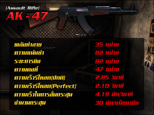เรื่องชื่อชั้นของปืนกระบอกนี้คงปฎิเสธไม่ได้ว่าไม่มีใครไม่รู้จัก AK-47 เจ้าพ่อนักดีดกระบอกนี้ แม้จะดูเป็นข้อด้อยเรื่องแรงถีบที่มากกว่าปืนในประเภท Assault Rifle ชนิดเดียวกัน แต่ผู้เล่นหลายคนกลับมองว่าเป็นข้อดีเสียด้วยซ้ำ กับสไตล์การยิงแบบนัดต่อนัด หรือรัวทีละไม่เกิน 2-3 นัด แทนการยิงกราดให้สิ้นเปลืองลูกกระสุน นั่นยิ่งส่งผลให้ระดับความแม่นยำของตัวปืนเพิ่มขึ้นไปอีก ในส่วนของพลังทำลายก็ใช่ย่อย ถือว่้าเป็นอันดับต้นๆ ของตระกูล Assault Rifle เลยทีเดียว