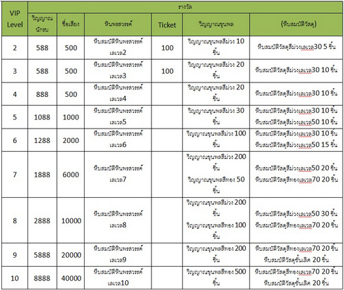 รายละเอียดกิจกรรม:ในช่วงระยะเวลากิจกรรม ผู้เล่นที่มีระดับ VIP ถึงกำหนดจะได้รับของรางวัล อย่าพลาดโอกาสดี ๆ แบบนี้นะ