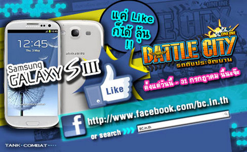 เพียงผู้เล่นเข้ามากด Like Face book ของเกม Battle City Online ที่ http://www.facebook.com/bc.in.th รับทันที 1 สิทธิ์ ในการลุ้นรางวัล Samsung Galaxy S III รุ่นใหม่ล่าสุด จำนวน 1 รางวัล พิเศษ! หากมีการแชร์ข้อมูลข่าวเรื่องนี้จากหน้า Facebook รับพิเศษอีก 1 สิทธิ์
