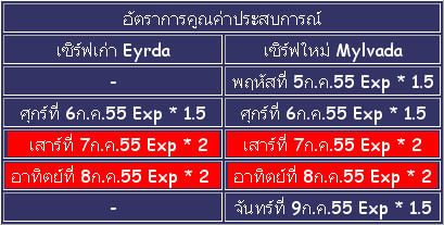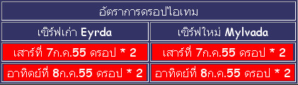 1.) Exp & ไอเทมดรอป คูณ 1.5 – 2 เท่า ทั้งสองเซิร์ฟเวอร์จะทำการคูณค่าประสบการณ์ พร้อมทั้งเพิ่มอัตราการดรอปไอเทมอีกด้วย โดยเฉพาะวันเสาร์-อาทิตย์นั้นอย่าให้พลาดเชียวเพราะคูณสูงสุดถึง 2 เท่า!! ทั้งค่าประสบการณ์และอัตราการดรอปไอเทม