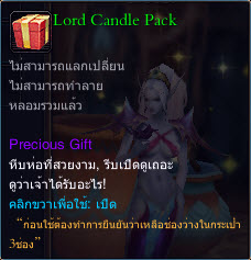 2.) แถมฟรี Lord Candle Pack เมื่อเติมเงิน+แปลงเงินครบ 2,000 บาท ภายในอาทิตย์แรก รับฟรีแพคเกจสัตว์เลี้ยงเทียนไข เฉพาะเซิร์ฟใหม่เท่านั้น