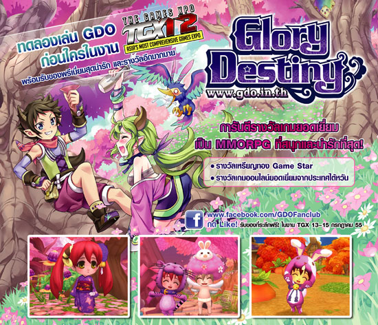 ได้เวลาแล้วที่เหล่าแฟนๆ เกม MMORPG จะร่วมเดินทางไปในดินแดนใหม่ ที่เต็มไปด้วยความสนุกสดใส กับเกม Glory Destiny Online เซิร์ฟเวอร์ไทย เกมแนว 3D MMORPG ใหม่ล่าสุด ซึ่งตอนนี้ก็พร้อมเปิดให้แฟนๆ ได้ทดลองเล่นก่อนใครในงาน TGX 13-15 ก.ค. นี้ ณ ศูนย์ประชุมแห่งชาติสิริกิติ์ เกมเมอร์ที่อยากสัมผัสเกม GDO ก่อนใครก็สามารถไปได้ที่งานเลยจ๊ะ