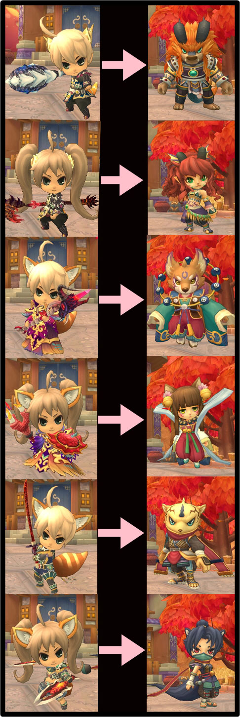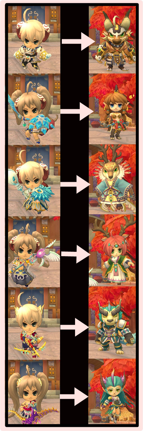 ถึงแม้ว่าตัวละครภายในเกมนั้นทำออกมาคล้ายกับตุ๊กตาก็ตาม แต่มันไม่ได้มีเพียงเท่านี้ เพราะพวกเขายังสามารถแปลงร่างเป็นอสูรได้อีกด้วย โดยรูปร่างจะแตกต่างกันตามเผ่ารวมถึงเพศของตัวละคร ระบบแปลงร่างเป็นสัตว์เทพของแต่ละอาชีพนั้นมีหน้าที่ไว้ทำคอมโบในการโจมตี ที่แม้แต่มอนสเตอร์ที่ว่าโหดขนาดไหนก็ยังยอมแพ้