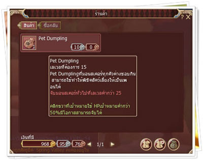 1. ได้จากการจับเอง ซึ่งต้องไปซื้อ Item จับ Monster จาก NPC แม่ค้า Pet ครับ แต่ว่า Item จะใช้ได้กับ Monster ที่มีเลเวลต่ำกว่า 25 เท่านั้น และถ้าเพื่อนๆ มีสัตว์เลี้ยงเยอะแล้วไม่รู้จะเอาไปไว้ไหนล่ะก็ สามารถเอามาฝากได้ที่โกดังที่ NPC สัตว์เลี้ยงเช่นกัน