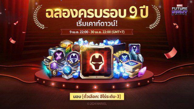 กรุงเทพฯ, ประเทศไทย (วันที่ 9 เมษายน พ.ศ. 2567) – เน็ตมาร์เบิ้ล ผู้พัฒนาและให้บริการเกมมือถือคุณภาพสูงชั้นนำ ฉลองครบรอบ 9 ปี สำหรับเกมมือถือ RPG ซูเปอร์ฮีโร่ฟอร์มยักษ์อย่าง MARVEL Future Fight เพื่อเป็นการเฉลิมฉลองครบรอบ 9 ปี ในวันที่ 30 เมษายน เหล่าเอเจนท์สามารถเข้าร่วมกิจกรรม “พรมแดงครบรอบ 9 ปี” สุดพิเศษในเวลาจำกัด พร้อมรับรางวัลล้ำค่าอีกมากมาย !