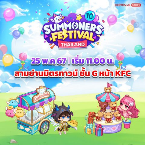 Summoners War ฉลอง ครบรอบ 10 ปี จัดงานใหญ่เอาใจเหล่าซัมมอนเนอร์ ภายใต้ชื่อ “Summoners Festival Thailand” ในวันเสาร์ที่ 25 พฤษภาคม 2567 ณ ศูนย์การค้าสามย่านมิตรทาวน์ ชั้น G หน้า KFC เวลา 11:00 น.เป็นต้นไป โดยภายในงานนี้นั้นมีกิจกรรมต่างๆมากมายให้ผู้เข้าร่วมงานได้เล่นสนุกและรับของรางวัลติดไม้ติดมือกลับบ้านกัน รายละเอียดกิจกรรมมีดังนี้