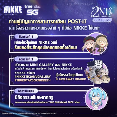สำหรับผู้บัญชาการชาวไทย ก็มีอีเวนต์พิเศษ ‘NIKKE 3D’ สร้างความตื่นเต้นและแปลกตา สำหรับการ เฉลิมฉลองครบรอบ 2 ปี เปิดประสบการณ์รำลึกความทรงจำระหว่างนิกเกะสาวและผู้บัญชาการ ณ True Branding Shop สาขา สยามสแควร์ซอย 2 โดยมีกิจกรรม ‘NIKKE 2ND ANNIVERSARY GALLERY’ ให้ได้เข้ารวมรับของรางวัลพิเศษมากมาย ฟรี! จนถึง 31 พฤศจิกายน 2567 นี้ อย่าลืมหาเวลาไปกันให้ได้นะ!
