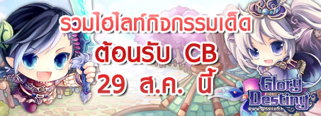 เกมออนไลน์ใหม่ Glory Destiny ตอนนี้ก็ใกล้ถึงเวลาที่ทุกคนรอคอยแล้ว นั่นก็คือการเปิดให้เล่นช่วง Close Beta ในวันที่ 29 ส.ค. 55 เวลา บ่าย 2 โมง นั่นเอง ซึ่งตอนนี้หลายๆ คนคงจะมี AC กันแล้ว เพราะในการเล่นช่วง CB เกม Glory Destiny Online เค้าใจดีแจก Cash ให้ไปช้อปปิ้งกันแบบฟรีๆ แต่ถ้าเพื่อนๆ คนไหนต้องการ Cash เพิ่มคงต้องหา AC มาลงทะเบียนด้วยนะจ๊ะ