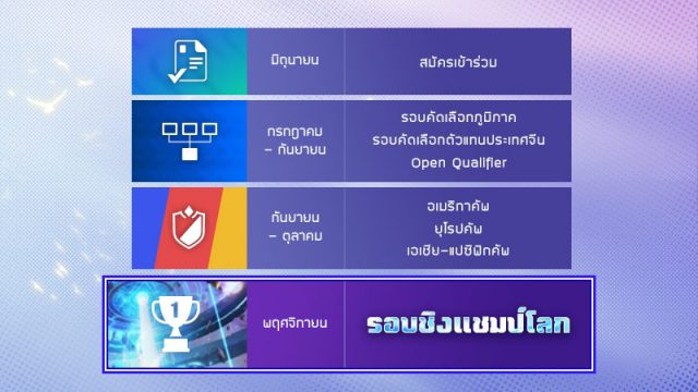 - คัดเลือกผู้เข้าแข่งขันเข้าสู่รอบคัดเลือกของแต่ละภูมิภาคจากผลคะแนน เวิลด์อารีน่า ซีซัน 32 และ 33 และเริ่มการแข่งขันรอบคัดเลือกตั้งแต่ปลายเดือนกรกฎาคม