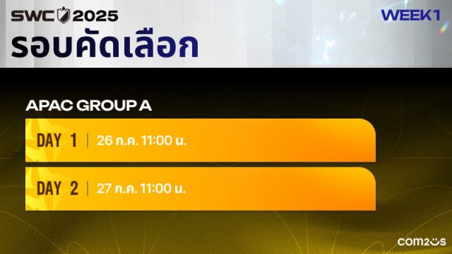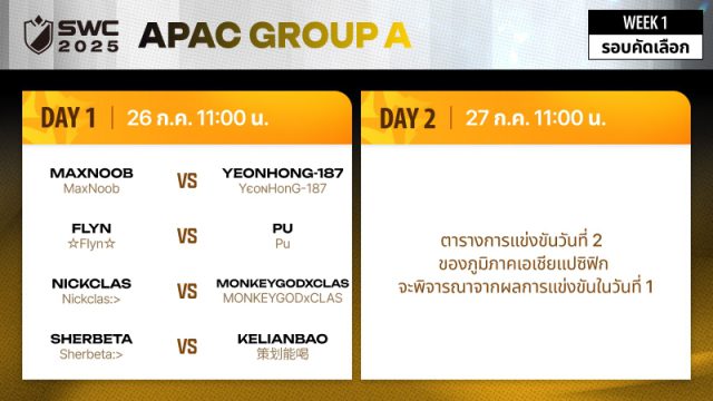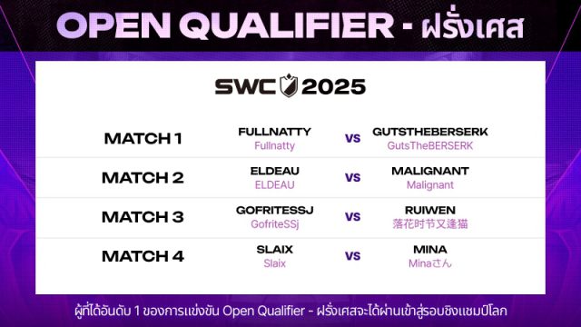 - SWC2025 เปิดศึกแมตช์แรก! รอบ APAC กลุ่ม A (เอเชียตะวันออกเฉียงใต้) วันที่ 26–27 เวลา 11:00 น. และ รอบ OPEN QUALIFIER – ฝรั่งเศส วันที่ 26 เวลา 19:00 น. (เวลาไทย)