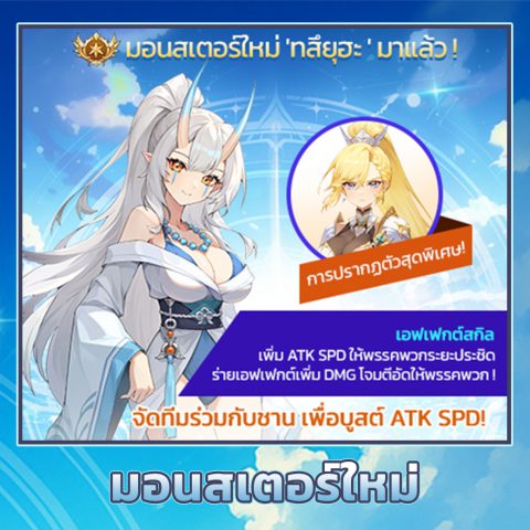 ‘ทสึยุฮะ‘ มอนสเตอร์เกรดตำนานตัวใหม่ เป็นอีกหนึ่งไฮไลท์สำคัญในอัปเดตนี้ ‘ทสึยุฮะ’ เป็นโอนิมูฉะธาตุน้ำ ในร่าง ปลุกพลัง รับหน้าที่เป็น ดีลเลอร์ระยะประชิด ที่ทำ DMG รุนแรงใส่ศัตรูที่ติดสถานะ CC พร้อมความสามารถในการเพิ่ม ATK SPD และ DMG โจมตีอัดให้พรรคพวกทุกตัวอีกด้วย และ เพื่อเป็นการฉลองเปิดตัวมอนสเตอร์ตัวใหม่ ก็ยังมีกิจกรรมให้ผู้เล่นสามารถรับมอนสเตอร์ได้ถึง 2 ตัว ทั้ง ‘ทสึยุฮะ‘ และ ‘ชาน‘ ที่จะมาเป็นคู่สุดแกร่งได้จนถึงวันที่ 17 กย. นี้