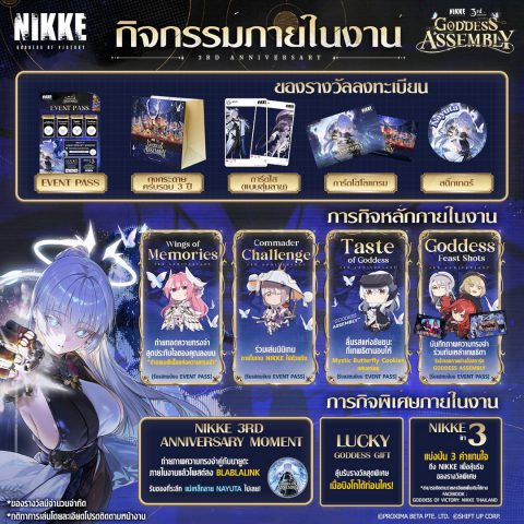- ถ่ายภาพกับเหล่าคอสเพลเยอร์ในบูธ Mission 2: Goddess Feasts Shot แล้วโพสลง Blablalink พร้อมติดแฮชแท็ก #NIKKE #NIKKETHGODDESSASSEMBLY เพื่อรับ 1 สแตมป์