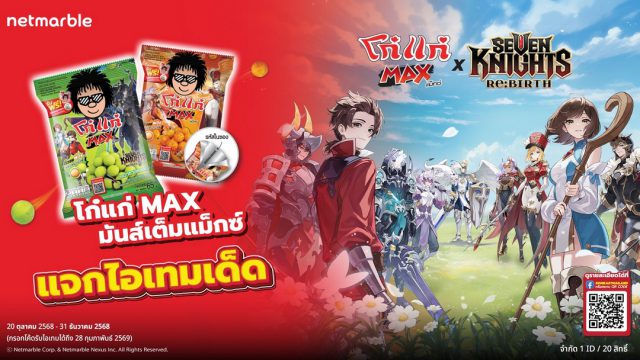 กรุงเทพฯ, ประเทศไทย (วันที่ 7 พฤศจิกายน พ.ศ. 2568) – Seven Knights Re:BIRTH เกม Collectible RPG ใหม่ล่าสุดจากค่าย เน็ตมาร์เบิ้ล จับมือร่วมกับบริษัท โรงงานแม่รวย จำกัด ผู้ผลิตขนมขบเคี้ยวถั่วกรอบสุดโปรดคู่คนไทยทุกเพศทุกวัยอย่าง ‘โก๋แก่’ มอบแคมเปญสุดพิเศษให้เหล่านักผจญภัยออกล่าความอร่อยเต็มคำพร้อมรับไอเทมเกมสุดเร้าใจ เพียงซื้อผลิตภัณฑ์ ‘โก๋แก่แม็กซ์’ รสวาซาบิซอสญุี่ปุ่น และ รสเท็กซัสบาร์บีคิว ลาย Seven Knights Re:BIRTH สุดพิเศษ ก็มีสิทธิ์ได้รับโค้ดไอเทมเพื่อลุ้นรับรางวัล เช่น อัศวินระดับ 4 ดาว (ริน, แทโอ), ตั๋วสำหรับเรียกอัศวิน, ตั๋วสำหรับเรียกสัตว์เลี้ยง, ทอง, หรือ กุญแจ ร่วมเคี้ยวมันส์คุ้มสองเด้งได้แล้วตั้งแต่ วันนี้ – 31 ธันวาคม 2568