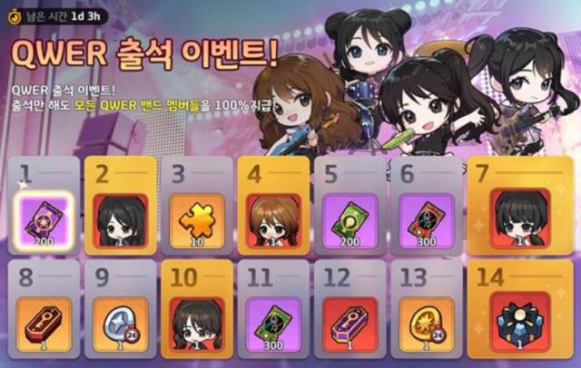 • เช็คอิน QWER ที่จะจัด จนถึงวันที่ 23 ธันวาคมนี้ โดยแจกรางวัลเป็นพรรคพวกเทพ QWER ทั้งสี่คน: โชดัน มาเจนต้า ฮินะ ชียอน และหีบเลือกคอลแลบฯ QWER เพียงแค่ล็อกอินให้ครบ 14 วัน