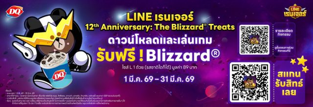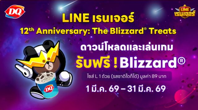 LINE เรนเจอร์ เกมมือถือสุดฮิตแนว จัดทีมตีป้อม จาก LINE ฉลองครบรอบ 12 ปีอย่างยิ่งใหญ่ ด้วยแคมเปญพิเศษ “The Blizzard® Treats” ขอเชิญชวนทั้ง ผู้เล่นทั้งหน้าใหม่ และ แฟนเกมตัวจริงกลับมาสนุกกับการผจญภัย พร้อมรับสิทธิ์ Dairy Queen Blizzard® ไซซ์ L ฟรี 1 ถ้วย มูลค่า 89 บาท เพียง ดาวน์โหลด และ ทำภารกิจในเกมตามเงื่อนไขที่กำหนด โดยกิจกรรมเริ่มตั้งแต่ 1 – 31 มีนาคม 2569 ที่ร้าน Dairy Queen สาขาที่ร่วมรายการทั่วประเทศ