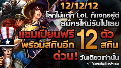 LoL แจกหนัก จัดเต็ม ฉลองร้อยปี มีหนึ่งครั้ง กับ วันที่ 12/12/12 แจกฟรี 12 แชมป์เปี้ยนพร้อม 12 สกินสุดพิเศษ เฉพาะผู้เล่นใหม่ที่สมัครไอดีภายในวันที่ 12 ธันวาคมและทำตามเงื่อนไขเท่านั้น !!