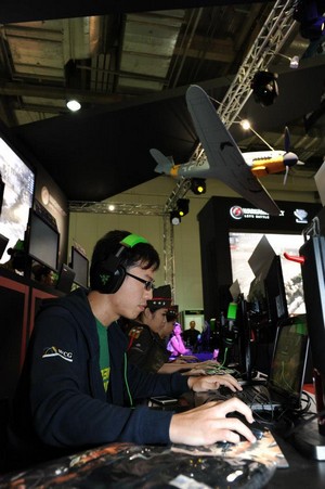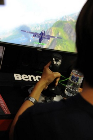 ผู้ร่วมงานทดสอบเกม World of Warplanes พร้อมอุปกรณ์จอยบังคับแบบพิเศษ