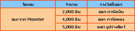 ผู้เล่นต้องเก็บขยะที่ดร็อปจาก Monster ใดๆ ก็ได้ ให้ครบตามจำนวน สามารถนำมาแลก เป็นไอเทม “การ์ดเงิน-การ์ดทอง-รูปร่าง” กับทางทีมงานได้