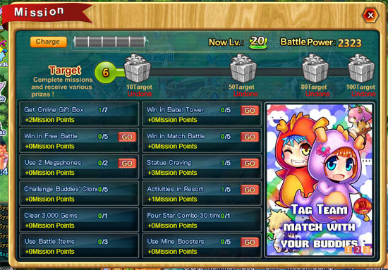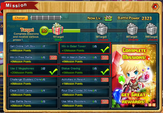 การทำภารกิจ จากหน้าจอเกม ให้ผู้เล่นกดเปิดดูภารกิจได้จาก ไอคอนรูปดาว (Mission)