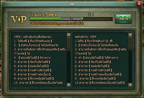 ระบบ VIP – ระบบสนับสนุนผู้เล่นหลังจากเงินตำลึงถึงยอดที่กำหนด ระบบนี้จะทำให้ผู้เล่นได้รับสิทธิพิเศษมากมายซึ่งจะทำให้ผู้เล่นกระโดดก้าวข้ามขีดจำกัดของเกมส์ได้อย่างรวดเร็วเลยทีเดียว