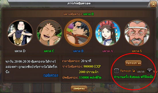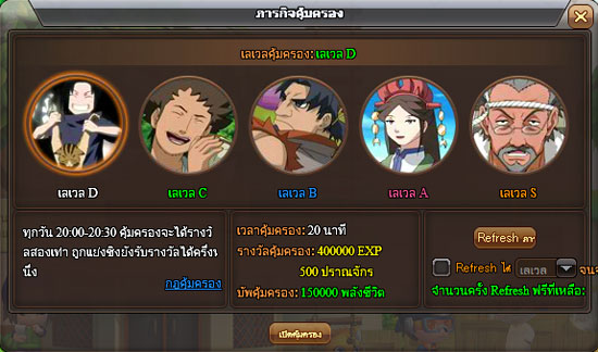 2. ระบบจะขึ้นหน้าต่างภารกิจคุ้มครองขึ้นมา ภารกิจคุ้มครองผู้เล่นไม่สามารถเลือกความยากของภารกิจเองได้เพราะระบบจะทำการสุ่มเลือกให้เอง แต่ผู้เล่นสามารถเปลี่ยนภารกิจเองได้ฟรี 3 ครั้งต่อ 1 วัน ถ้าหลังจากนั้นจะต้องเสียแต้มมอลล์ในการเปลี่ยน