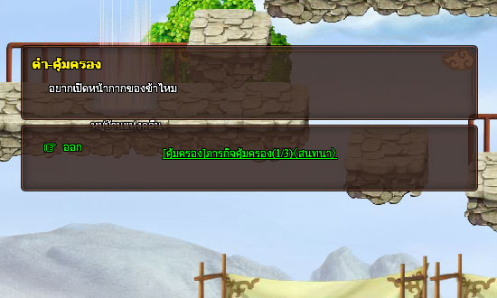 3. กดรับภารกิจคุ้มครองที่ “ปุ่มเปิดคุ้มครอง” เมื่อกดปุ่มนี้แล้ว ตัวละครของผู้เล่นจะทำการเดินไปทำภารกิจเองทันที โดยสังเกตง่ายๆ คือ ถ้าตัวละครของเรากำลังทำภารกิจคุ้มครองอยู่จะมีธงขึ้นอยู่บนหัวของตัวละครเราและเราจะมีเวลาเพียงแค่ 20 นาทีเท่านั้น ต่อการทำภารกิจ 1 ครั้ง