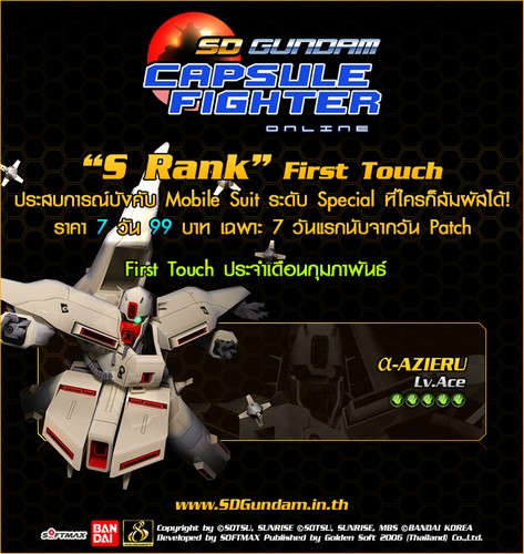 อัพเดท Mobile Suit ระดับ Rank S ในโปรโมชั่น “S-Rank First Touch” ซึ่งเป็นข้อตกลงพิเศษกับทีมผู้พัฒนาเกาหลี เพื่อเปิดทางเลือกอีกทางหนึ่งให้ Pilot ชาวไทยสัมผัสประสบการณ์บังคับยูนิตระดับ Special แบบง่ายๆ ไม่ต้องลุ้น ไม่ต้องสะสมแปลน ในราคาเบาๆ โดยเดือนนี้มียูนิตใหม่อย่าง α-AZIERU มาให้สัมผัสกันในราคา 7 วัน 99 บาท!! สำหรับ Limited Edition เดือนนี้จะเปิดให้เช่าใน Shop เฉพาะ 7 วันแรกหลัง Patch ทุกเดือนเท่านั้นและเตรียมพบ Mobile Suit ใหม่พร้อมเสิร์ฟแบบไม่ซ้ำกันทุกเดือนได้ที่นี่