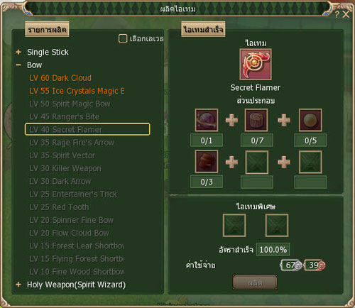 แพทช์เก่านั้นอาวุธส้มตั้งแต่ Lv25-40 จะไม่สำเร็จ 100% และใช้ของในการคราฟเยอะกว่าแพทช์ใหม่ (ยกตัวอย่างจากในภาพอาวุธ Lv40)