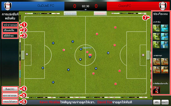 6. สถานะนักฟุตบอล : ด้านล่างตรงบริเวณภาพสนามฟุตบอล จะบอกสถานะของนักฟุตบอลในทีม ไม่ว่าจะเป็นความฟิต, เกรดของนักฟุตบอล และรวมไปถึงสถานะต่างๆ ของนักฟุตบอลด้วย