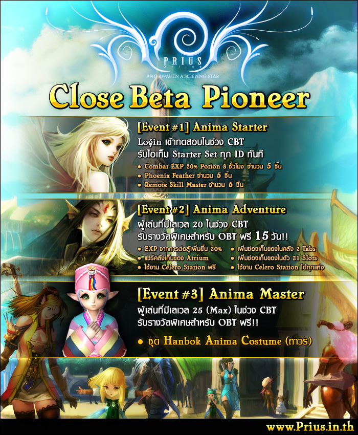 Prius Online ร่วมฉลองปีใหม่ส่งความสุขให้แฟนๆ ชาวไทย ยกขบวนกิจกรรมใหญ่ต้อนรับ Close Beta นี้ ขนไอเท็มมากมายมาแจกกระจายให้มันส์ยิ่งขึ้นถึง 3 ต่อด้วยกัน เปิดด้วยกิจกรรมแรก Anima Starter แจกไอเท็มชุดเริ่มต้นทันทีเพียง Login เข้าร่วมทดสอบ Prius กับเราเท่านั้น ตามมาด้วย Anima Adventure แจกไอเท็มผจญภัยครบชุด ให้ชาว Prius ที่มีเลเวล 20 ขึ้นไป นำไปใช้ในช่วง Open Beta