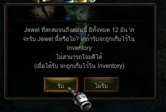 กรณีที่พอใจกับผลของการขุดแร่แล้ว หลังจากตัวละครหยุดขุดแร่ให้เราคลิกไปที่ทางเดินอื่นๆ ที่ไม่ใช่แร่ จะปรากฏกล่องข้อความ ให้เราคลิกที่ปุ่มรับเพื่อรับรางวัล Jewel ทันที