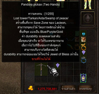 วิธีการซ่อมไอเทมนั้นไม่ยากครับ เพียงแค่ยกไอเทม Jewel of Bless แล้วนำไปวางบนไอเทม Pandora Pickax ก็จะเป็นการซ่อมแซมแล้ว (ทำเหมือนตอนตีบวกทั่วไป) โดย Jewel of Bless 1 เม็ด จะซ่อมได้ 4 Durability