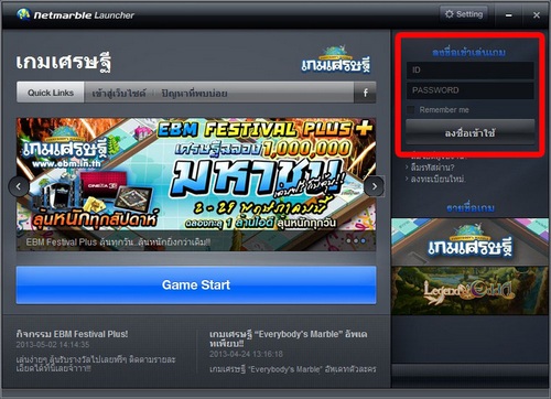 ข่าวดี!! สำหรับผู้ที่อยากเล่น เกมเศรษฐี Everybody’s Marble วันนี้…สามารถสมัครเล่นเกมเศรษฐีได้ทันที ไม่ต้องยืนยันอีเมล์ (Email Activation) ด้วยการใช้ Facebook ID ได้แล้วจ้า แค่เพียงมหาชนชาวเกมเศรษฐีมี ID ที่ Login ผ่าน Facebook ท่านก็สามารถนำมาลงทะเบียนเป็น Netmarble Id ได้ง่ายๆ โดยทำตามขั้นตอนดังนี้