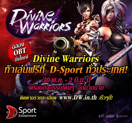 โดยทีมงานอินิทรีร่วมกับ D-Sport จัดกิจกรรมสุดพิเศษ “Divine Warriors ท้าเล่นฟรีที่ D-Sport ทั่วประเทศ!!” นอกจากสาวก DW จะได้เล่นเกม Divine Warriors มันส์ๆ กันในร้านเนตสุดหรูอย่างร้าน D-Sport ฟรีๆ แล้ว ยังมีโอกาสเป็นผู้โชคดีกันอีกด้วย!!!!!! โดยพี่ๆ จีเอ็มจะสุ่มร้าน D-Sport หาผู้โชคดีที่กำลังเล่นเกม DW อยู่ เจอปุ๊บแจกปั๊บรับไปเลยทุนการศึกษาและของรางวัลอี่นๆ อีกมากมาย รวมมูลค่ากว่า 10,000 บาท (พี่ๆ จีเอ็มขอสุ่มเฉพาะร้าน D-Sport ในเขตกรุงเทพฯ นะค๊า.. >,<)