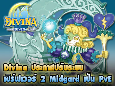 ประกาศด่วนจ้า~ จากทีมงานเกมส์ Divina Online โดยหลังจากการ MA Server ในวันอังคารที่ 18 มิถุนายน 2556 นี้ ทางทีมงานจะมีการปรับระบบของเซิร์ฟเวอร์ 2 Midgard จากเดิมที่จะเป็นระบบ PvP (Player Versus Player) โดยปรับเปลี่ยนเป็น PvE (Player Versus Environment) ซึ่งจะทำให้ผู้เล่นไม่สามารถ Free PK กับผู้เล่นคนอื่นๆ ในแผนที่ทั่วไปได้อีก