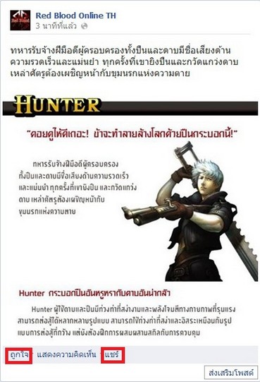 กิจกรรมร่วมสนุกกันได้ง่ายๆ กับเกมใหม่ Red Blood Online เพียงแค่เพื่อนๆ เข้ามาเป็นสมาชิก จากนั้นกด Like และ Share รูปสายอาชีพที่ชื่นชอบ ก็มีสิทธ์ลุ้นรับเสื้อยืดและหมวกสุดเก๋ไปเลยฟรีๆ
