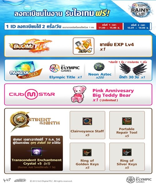 2. Ini3 E-LYMPIC Stamp ร่วมสนุกกับมินิเกมจาก 5 เกม ได้แก่ Pangya, Club Mstar, C9, Boomz และ 3KPQ เพื่อลุ้นรับแรร์ไอเทมของเกมต่างๆ ฟรี!!! ทั้ง 2 วัน