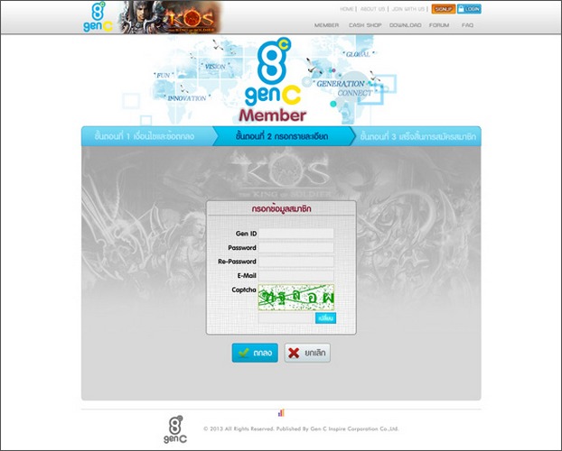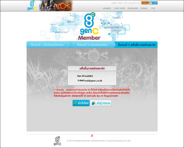 3. เสร็จสิ้นการลงทะเบียน สามารถใช้ไอดีดังกล่าวเข้าเล่นเกมออนไลน์ KOS ได้ทันทีเมื่อเกมเปิด (CBT 3 กรกฎาคม 56)