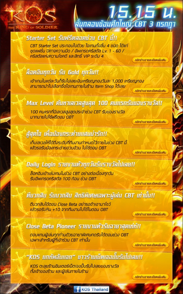 ดีเดย์ 3 กรกฎาคมนี้ เวลา 15.15 น.!! ฤกษ์งามยามดี เตรียมตัวพร้อมรบ ทดสอบก่อนสมรภูมิจริง Close Beta เพียง 5 วันเท่านั้น! พบกับความมันส์เต็มอัตราศึกของเกมส์สงครามสุดยิ่งใหญ่ KOS : The King Of Soldier พร้อมไฮไลท์กิจกรรมมากมายที่ขนมาให้ได้ร่วมสนุกกัน ห้ามพลาดโดยเด็ดขาด