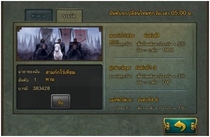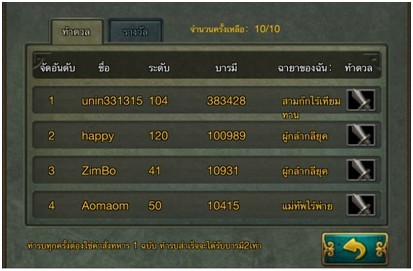 ผู้เล่นที่มีเลเวล 30 ขึ้นไปสามารถท้าดวลผู้เล่นที่มีบารมีสูงเพื่อรับรางวัลค่าบารมีได้ ระบบจะจัดอันดับรายชื่อท้าดวล ตามลำดับค่าบารมี 100 อันดับแรก รีเฟรชทุก 24 ชั่วโมง 1 ครั้ง และอัพเดททุกวันเวลา 05.00 น. ผู้เล่นที่มีรายชื่อในอันดับจะได้รับฉายา ทุกวันสามารถนำไปรับรางวัลBUFFเพิ่มป้องกันโจมตีและเงิน ผู้เล่นท้าดวลได้เพียงคนที่มีค่าบารมีต่ำกว่าตัวเองเท่านั้น ทุกครั้งที่ท้าดวลใช้คำสั่งทหาร 1 ฉบับ