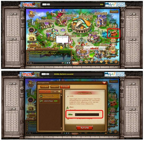 โดยปุ่ม กิจกรรมจะอยู่ด้านขวามือของจอ เมื่อกดเข้าไปแล้ว เลือกที่โปรโมชั่น จะมีช่องซีเรียลให้ใส่ สามารถนำ CODE ที่ได้ กรอกลงไป และรับไอเทมในกล่องจดหมายได้ทันที