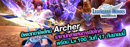 สวัสดีครับแฟนๆ Legendary Heroes ทุกท่าน วันนี้มีข่าวดีมาบอกอีกแล้ว สิ้นสุดการรอคอย อัพเดทอาชีพใหม่ Archer พร้อมเล่น 17 กันยายนนี้แน่นอน อาชีพใหม่ที่หลายๆ คนเฝ้ารอและนอกจากการอัพเดท อาชีพใหม่ Archer ทีมงานยังได้ขยายเพดานเลเวลจากเดิม Lv.80 เป็น Lv.100 ด้วยครับ ส่วนอาชีพ Archer นั้นจะมีจุดเด่นและ Skill แบบไหนกันนั้น ตามไปชมกันเลยครับ