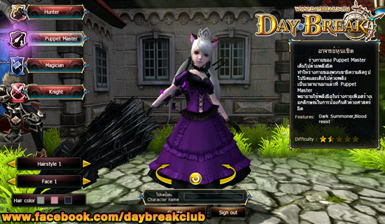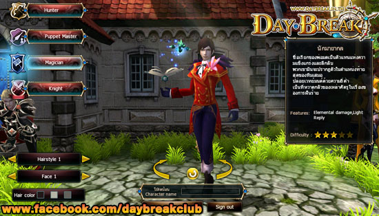 4 อาชีพหลักในเกม DAY BREAK ที่ชาวเกมเมอร์จะต้องเลือกเล่นอาชีพใดอาชีพหนึ่ง ได้แก่อาชีพ Knight, Arche, Wizard, Puppet Master นอกจากนั้นยังสามารถเลือกรูปแบบหน้าตาตามที่ต้องการได้อีกด้วยเช่นกัน