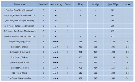– ถ้าผู้เล่นที่ใช้อาวุธตีบวก ธาตุ น้ำแข็ง (I) ต่อสู้กับ มอนสเตอร์ภายในดันเจี้ยน จะทำให้โจมตีแรงขึ้นกว่าปกติ