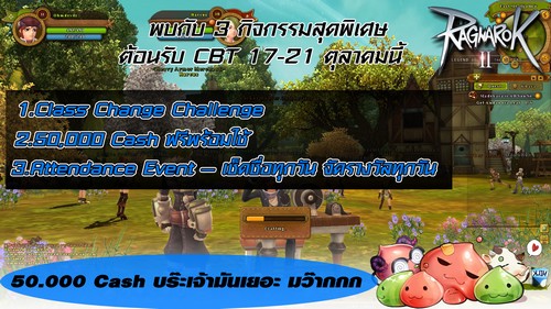 สำหรับช่วง CBT นั้นสาวก RO2 จะได้พบกับกิจกรรมสุดพิเศษถึง 3 กิจกรรมได้แก่ 50,000 Cash ฟรีพร้อมใช้ แค่ Login เข้าเล่นเกมในช่วง CBT นี้ก็รับ Cash ไปเลยถึง 50,000 Cash ทุกไอดี ต่อกันด้วยกิจกรรมสุดท้าทายอย่าง Class Change Challenge เพียงแค่เปลี่ยนเป็น Class 2 ก็รับเซทไอเทมเทพอย่าง Rotten Molar Rarity : Epic ไปใช้ในช่วง OBT กันแบบฟรีๆ เลย