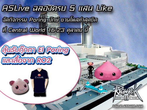 เท่านั้นยังไม่พอ Ragnarok 2 ยังสร้าง Poring ยักษ์หน้าลานเซ็นทรัลเวิลด์ พร้อมกิจกรรม Poring ยักษ์ชวนโพสท่าสุดชิค เพียงแค่เหล่าเกมเมอร์ร่วมถ่ายภาพกับ Poring ยักษ์ แล้วนำมาโพสที่ หน้าแฟนเพจ AsiasoftLive พร้อมกับข้อความ สั้นๆ ว่า “คุณอยากบอกอะไรกับ Grand Poring” ใครมียอด Like สูงที่สุด 10 อันดับแรกก็รับตุ๊กตา El Poring ไปเลย และ สุ่มจับรางวัลแจกเสื้อจาก Ragnarok II อีก 10 รางวัล