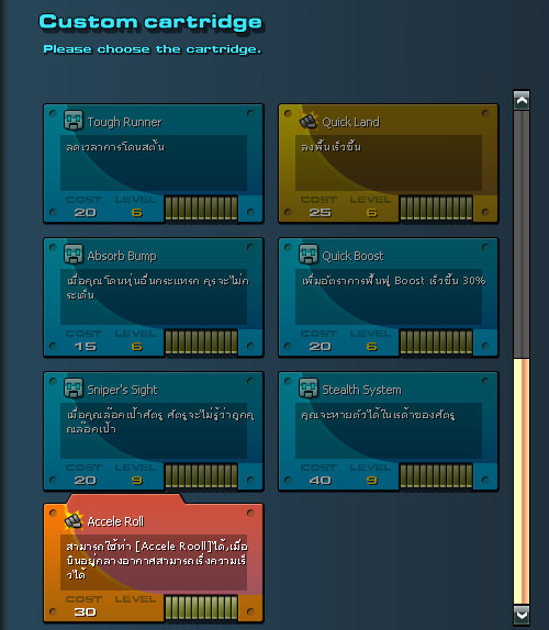 5. เลื่อนลงมาด้านล่างสุดของหน้าจอ Cartridge จะพบสกิล Accele Roll หรือ Air Loop ตามที่ติดตั้งมา ให้ยืนยันการติดตั้งสกิล แล้วกด Level up อีกครั้ง แต่ต้องมีค่า Cost เพียงพอให้ติดตั้งด้วย