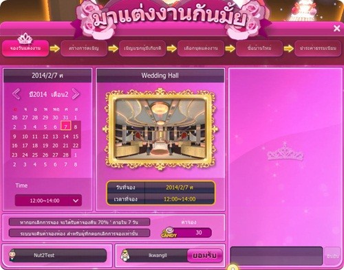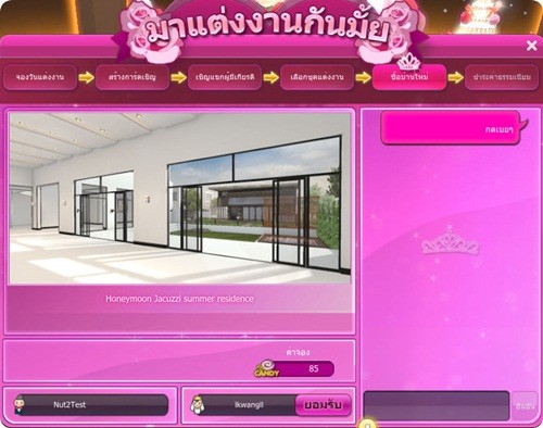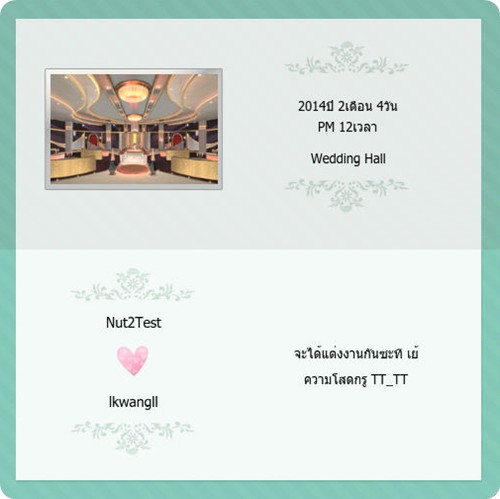 4. สถานที่จัดงาน : สถานที่สำหรับจัดงานแต่งงาน จะถูกเนรมิตใน Speacial Lobby ซึ่งภายใน 1 วันจะรองรับจัดงานแต่งงานเพียง วันละ 20 คู่เท่านั้น และผู้เล่นท่านอื่นจะสามารถมองเห็นห้องสำหรับจัดงานได้จาก Lobby List